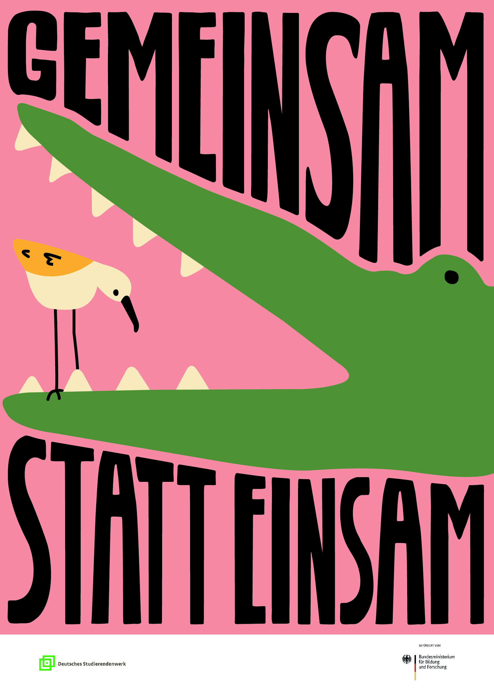 Mit Krisen können wir nicht allein umgehen und wir können sie noch weniger allein bewältigen. Dazu brauchen wir Gemeinschaft und Zusammenhalt. Die Symbiose zwischen Vogel und Krokodil soll das sinnbildlich darstellen: Zwei Tiere, die verschiedener nicht sein könnten, arbeiten zusammen und lösen so die gegenseitigen Probleme. In unserer Gesellschaft werden Unterschiede häufig als Anlass zur Diskriminierung genommen. Wenn wir stattdessen die Schönheit der Vielfalt anerkennen und diese als eine Stärke sehen, lassen sich Krisen einfacher bewältigen. Der Satz „Gemeinsam statt einsam“ in Verbindung mit der kindlichen Darstellungsweise, scheint auf den ersten Blick naiv, doch ist es eine grundlegende Aufforderung zur Zusammenarbeit und Empathie. Etwas, was wir Kindern beibringen, aber als Erwachsene scheitern umzusetzen.