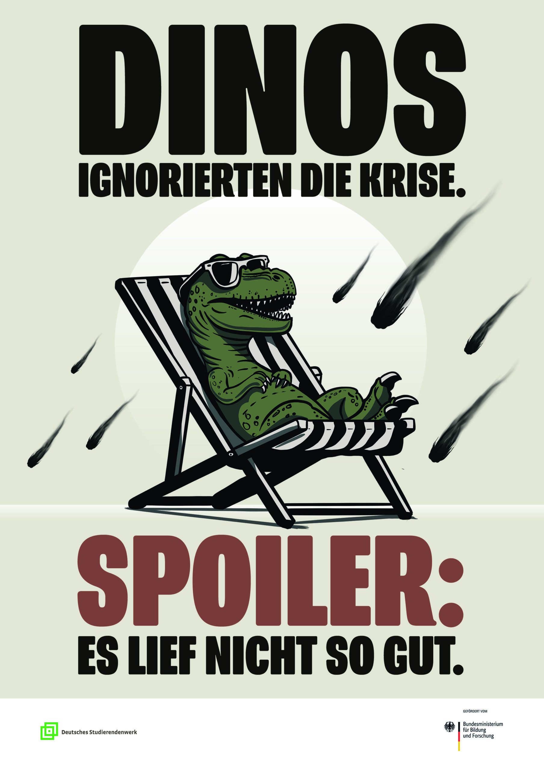 Das Plakat erinnert uns mit einem Augenzwinkern daran: Wer Krisen ignoriert, ist irgendwann ausgestorben. Die Dinos haben die Meteoriten nicht ernst genommen, und naja, ihr wisst schon, wie das Ganze ausging. Deshalb sollten wir die aktuellen Herausforderungen wie Klimawandel und Co. ernst nehmen und handeln, bevor es uns ähnlich wie den Dinos ergeht.